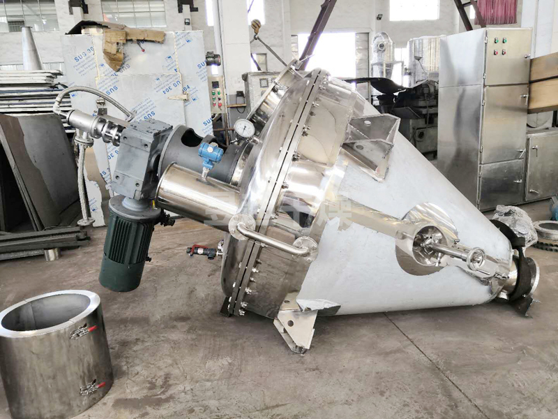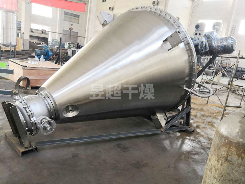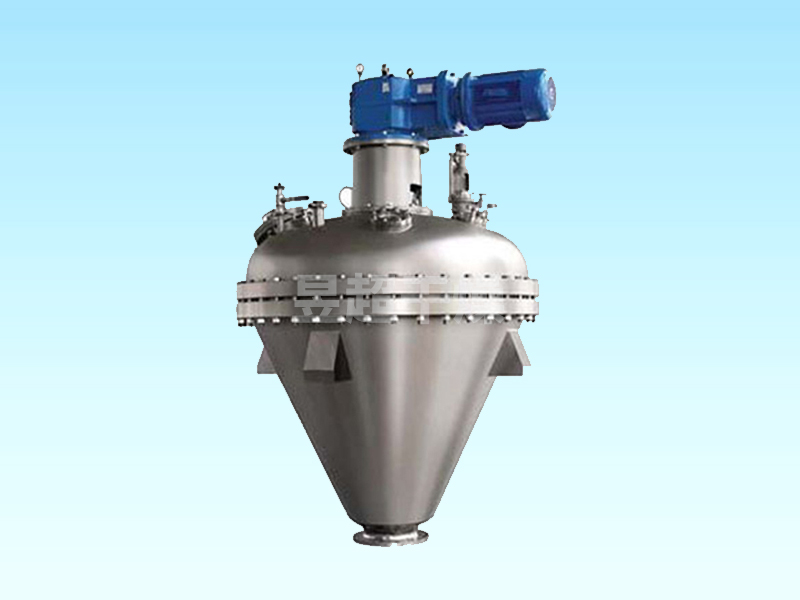 本机由加热锥体设有加热夹套,热源为热水、导热油或低压蒸汽,从而使锥体内壁保持一定的的温度。变频调速电机经平行斜齿轮减速机,驱动单螺带搅拌器旋转,带动物料沿锥型筒旋转并自下而上提升,物料到达高点后由重力和惯性作用,自动流向旋涡中心回到锥型筒体底部,整个过程使物料在锥型筒体内强制加热,相对对流、掺混,热量在物料中相互扩散,使物料作全方位的不规则往复运动,完成物料同单螺带和筒壁表面进行高频率传热交换,在短时间内达到加热干燥的效果。从而使物料内部水份不断蒸发,在真空泵的作用下,水蒸汽由真空泵引出,如须回收液体可加冷凝器、回收液储罐回收。干燥完成后,打开下部的出料阀出料。