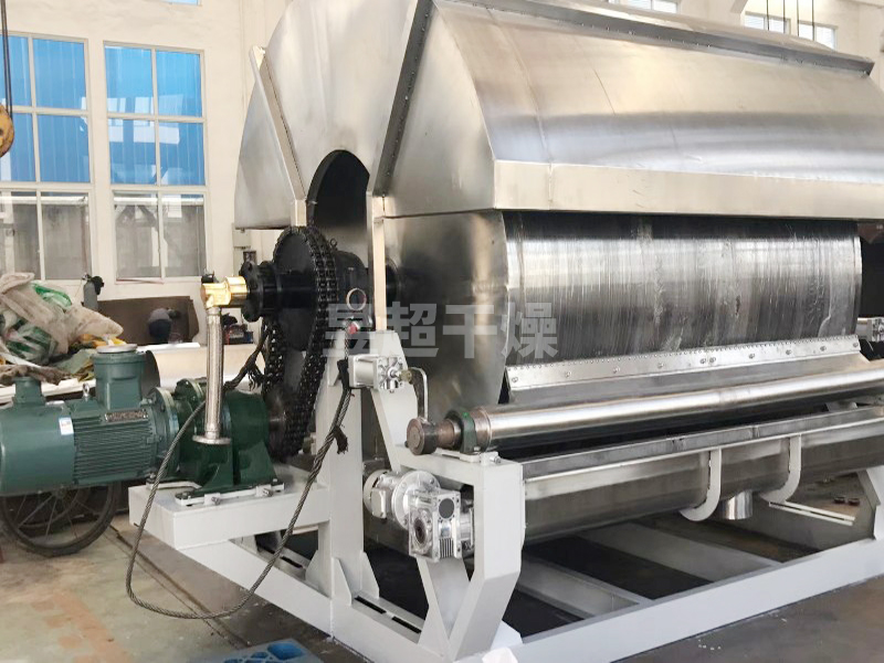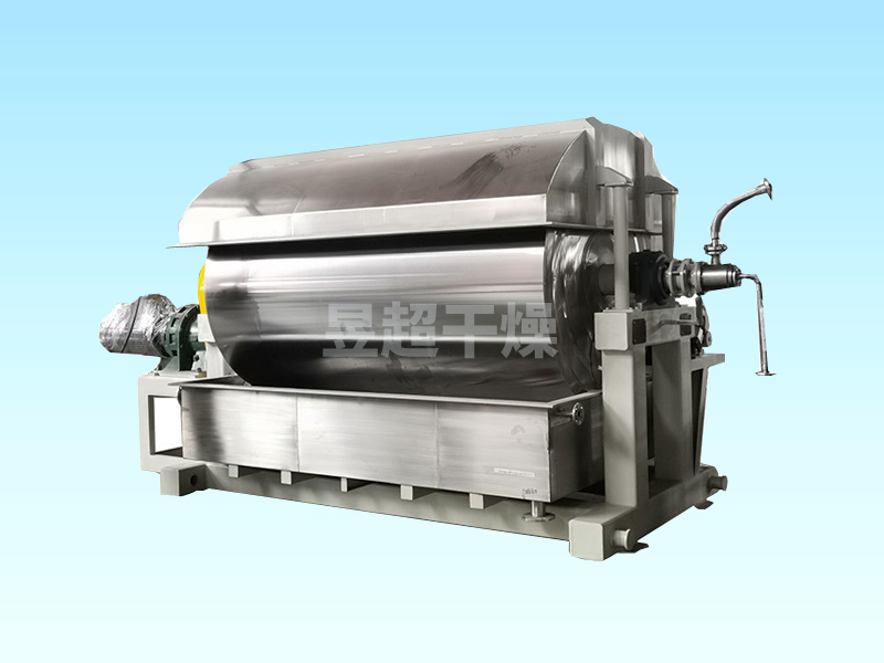 液体或泥浆状物料在水蒸汽或其它热载体加热的滚筒表面形成薄膜,并在滚筒转一圈的过程中便被干燥完毕,利用刮刀把产品刮下来,露出滚筒表面再次与原料接触形成薄膜进行干燥。
