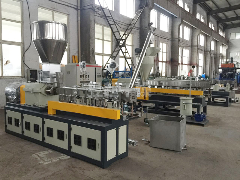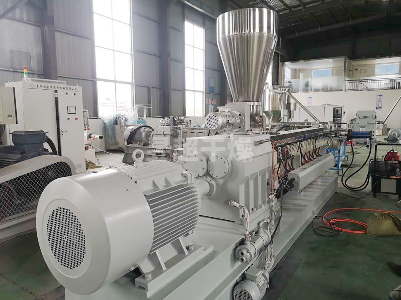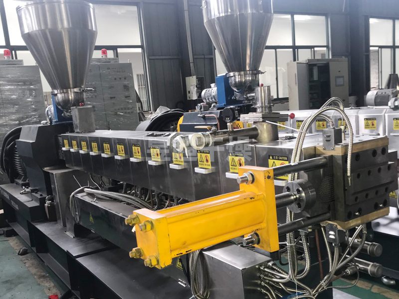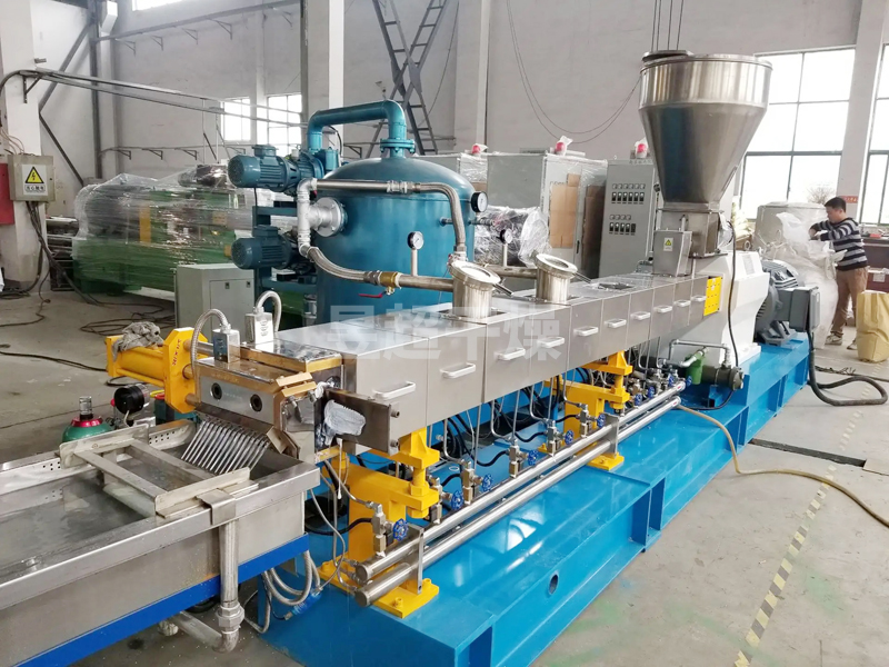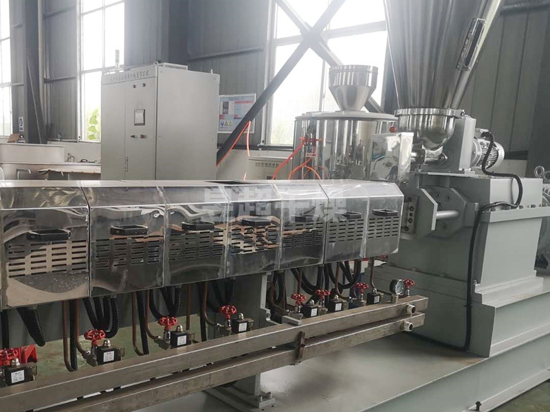 SET型双螺杆挤出造粒机分前出料式和侧出料式,前出料式造粒直径一般在1.5-12mm之间选择,侧出料式造粒直径一般在0.7-2.0之间选择颗粒形状为圆柱状,成粒率≥95%,出料口设有切断颗粒装置,长条干燥完自然成一节一节颗粒,设备前端还设有水冷却装置,使管内降低温度使出料速度快。