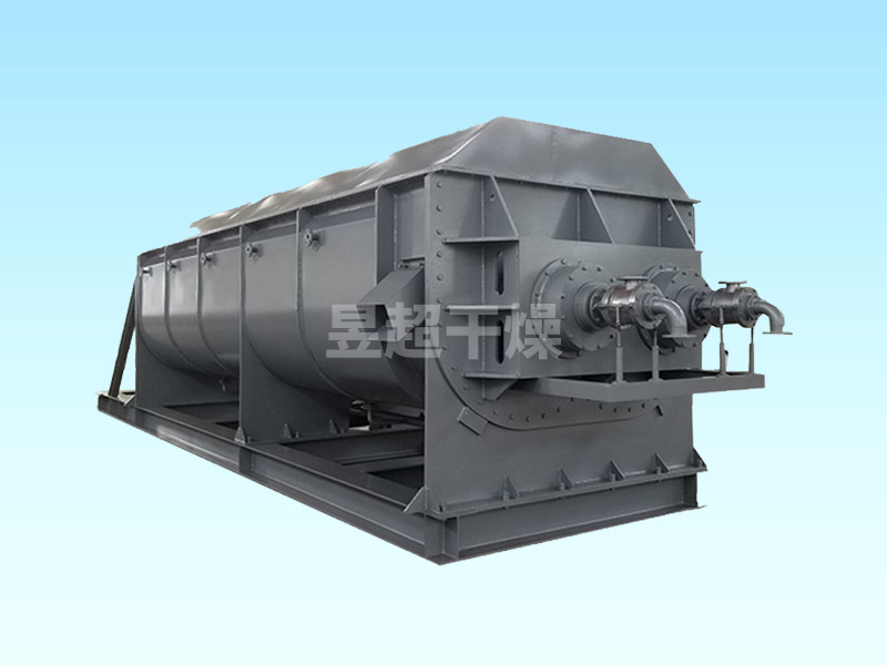 空心轴上密集排列着楔型中空浆叶,热介质经空心轴流经浆叶。单位有效容积内传热面积很大,热介质温度从-40℃到320℃,可以是水蒸汽,也可以是液体型:如热水、导热油等。间接传导加热,没有携带空气带走热量,热量均用来加热物料。热量损失仅为通过器体保温层向环境的散热。楔型浆叶传热面具有自清洁功能。物料颗粒与楔型面的相对运动产生洗刷作用,能够洗刷掉楔型面上附着物料,使运转中一直保持着清洁的传热面。浆叶干燥机的壳体为Ω型,壳体内一般安排二到四根空心搅拌轴。壳体有密封端盖与上盖,防止物料粉尘外泄而充分发挥作用。