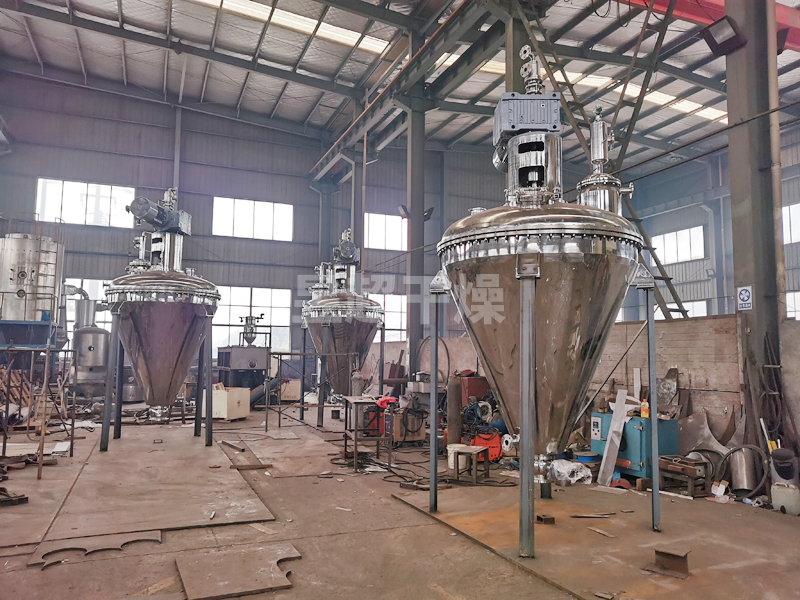 本机由加热锥体设有加热夹套,热源为热水、导热油或低压蒸汽,从而使锥体内壁保持一定的的温度。变频调速电机经平行斜齿轮减速机,驱动单螺带搅拌器旋转,带动物料沿锥型筒旋转并自下而上提升,物料到达高点后由重力和惯性作用,自动流向旋涡中心回到锥型筒体底部,整个过程使物料在锥型筒体内强制加热,相对对流、掺混,热量在物料中相互扩散,使物料作全方位的不规则往复运动,完成物料同单螺带和筒壁表面进行高频率传热交换,在短时间内达到加热干燥的效果。从而使物料内部水份不断蒸发,在真空泵的作用下,水蒸汽由真空泵引出,如须回收液体可加冷凝器、回收液储罐回收。干燥完成后,打开下部的出料阀出料。