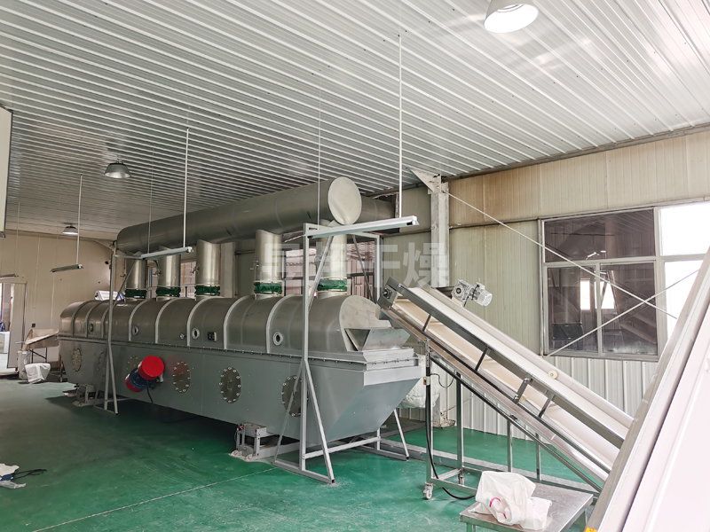 物料自进料进口进入机内,在振动力作用下,物料沿水平面流化床抛掷,向前连续运动,热风向上穿过流化床同湿物料换热后,湿空气经旋风分离器除尘后由排风1:3排出.干燥物料由排料进口排出。